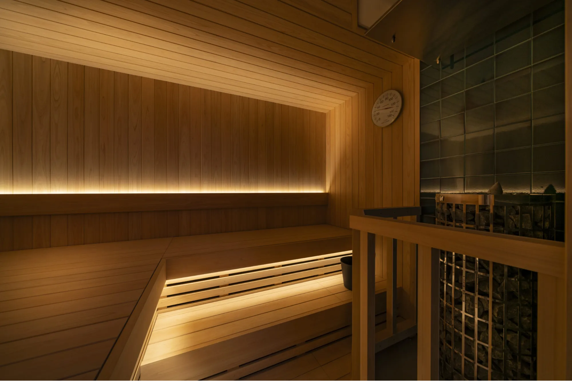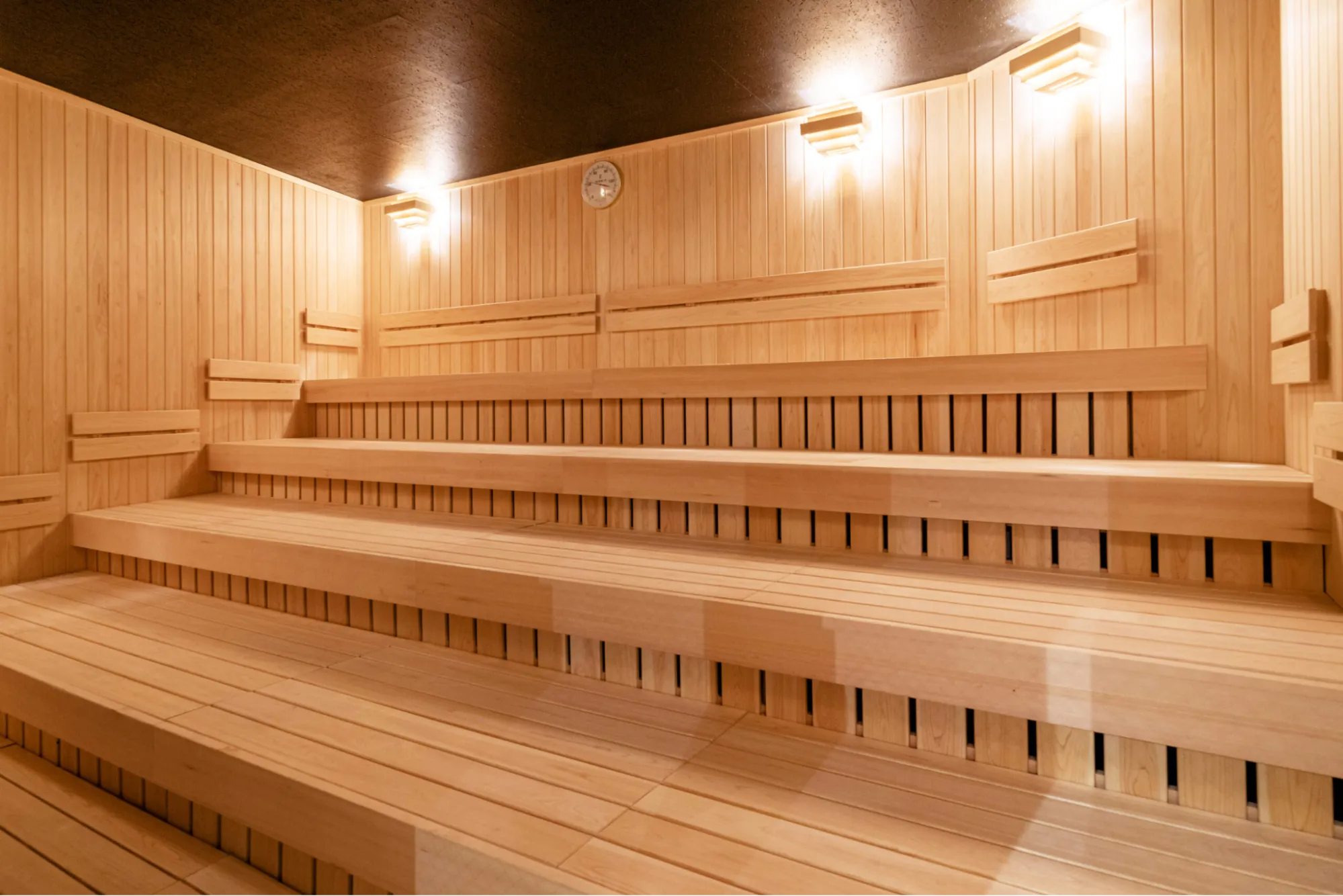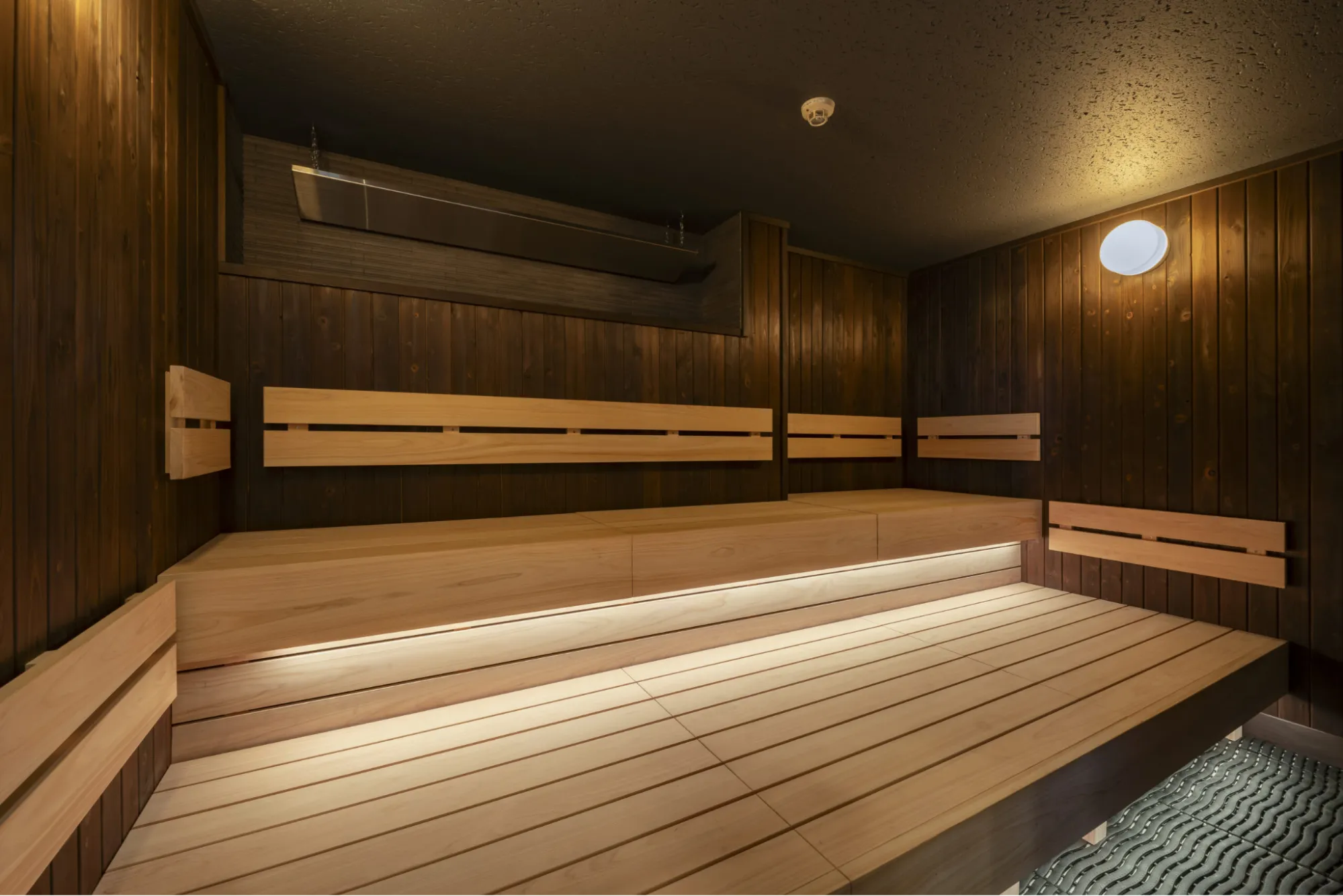 また、サウナ室は100〜110℃の高温設定で、四隅それぞれでベンチの高さを変え、好みの温度帯を選べる設計が施されています。