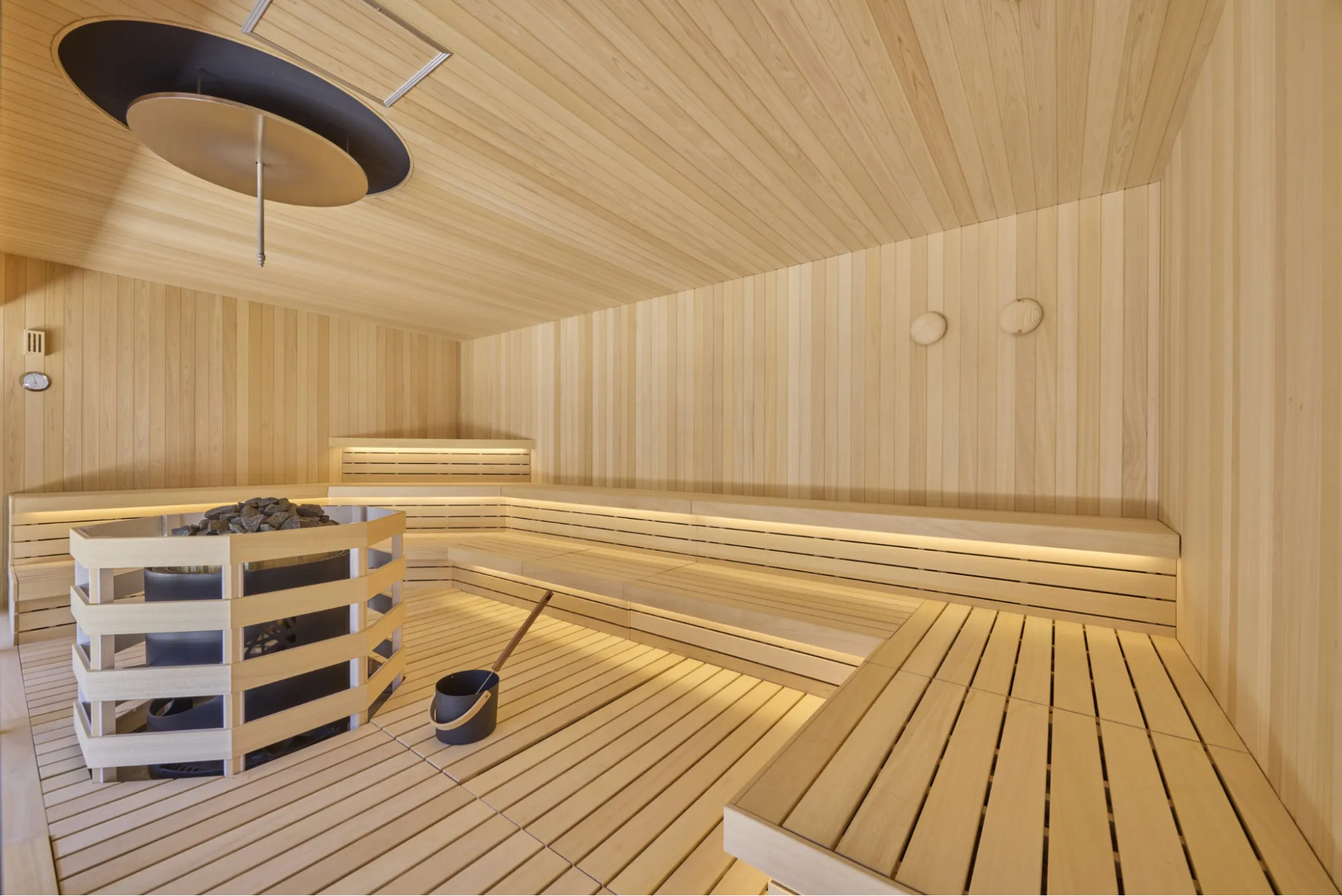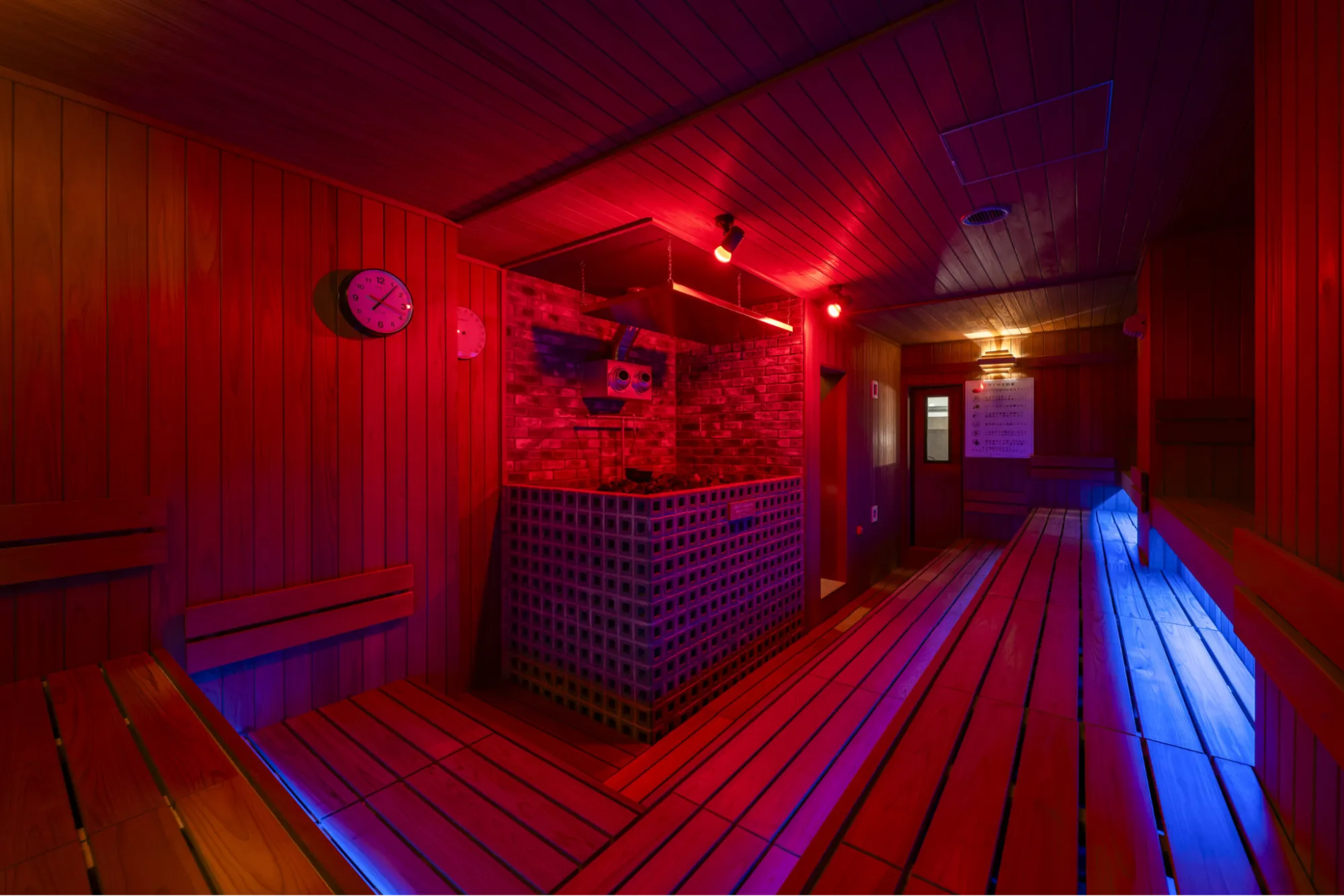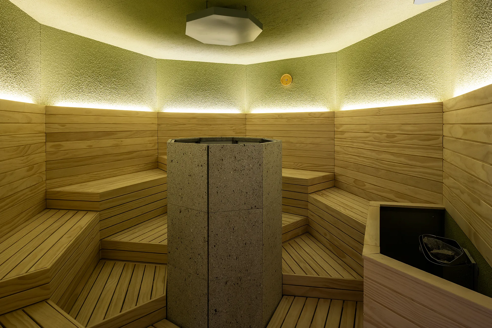 また、サウナ室は100〜110℃の高温設定で、四隅それぞれでベンチの高さを変え、好みの温度帯を選べる設計が施されています。