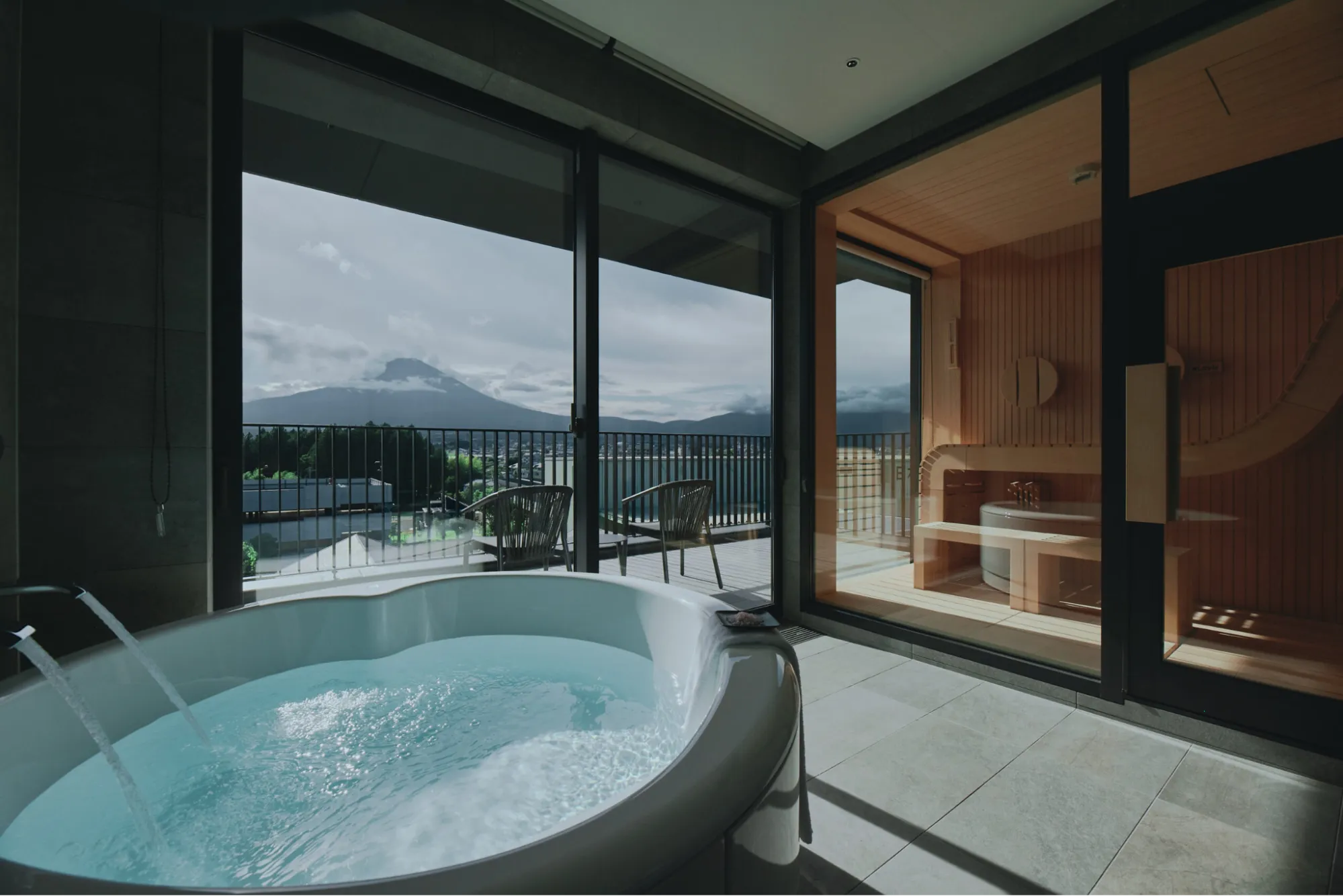 富士山の絶景を活かした開放感あふれるガラス張りサウナ