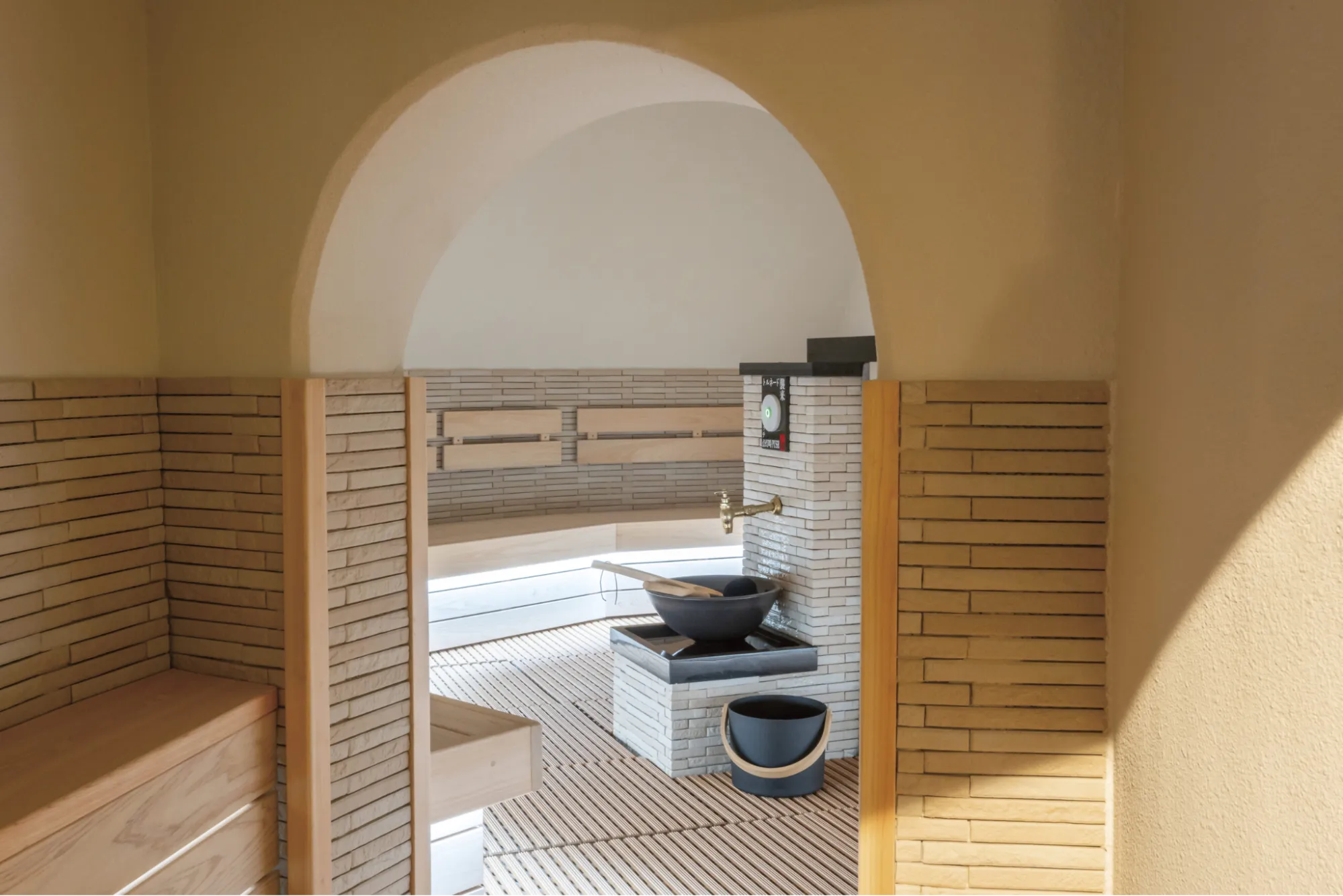 サウナ室は正方形に近いプランで可能な限り定員を確保し、壁・天井には調湿性と耐熱性に優れたバンドーウール左官材を採用。