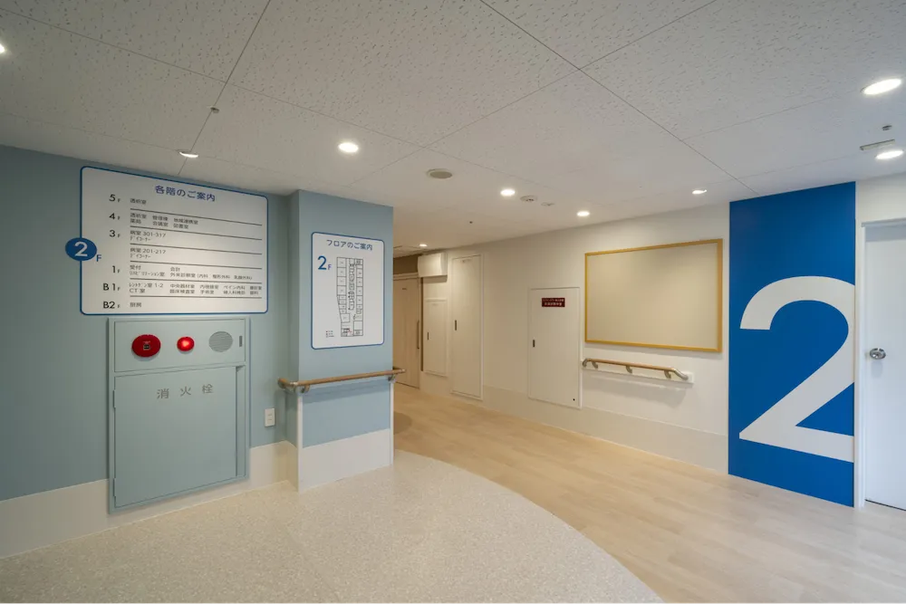 各フロアごとにアクセントカラーを変えており、患者様が視覚的に目的の診療科や場所を認識しやすくなっています。