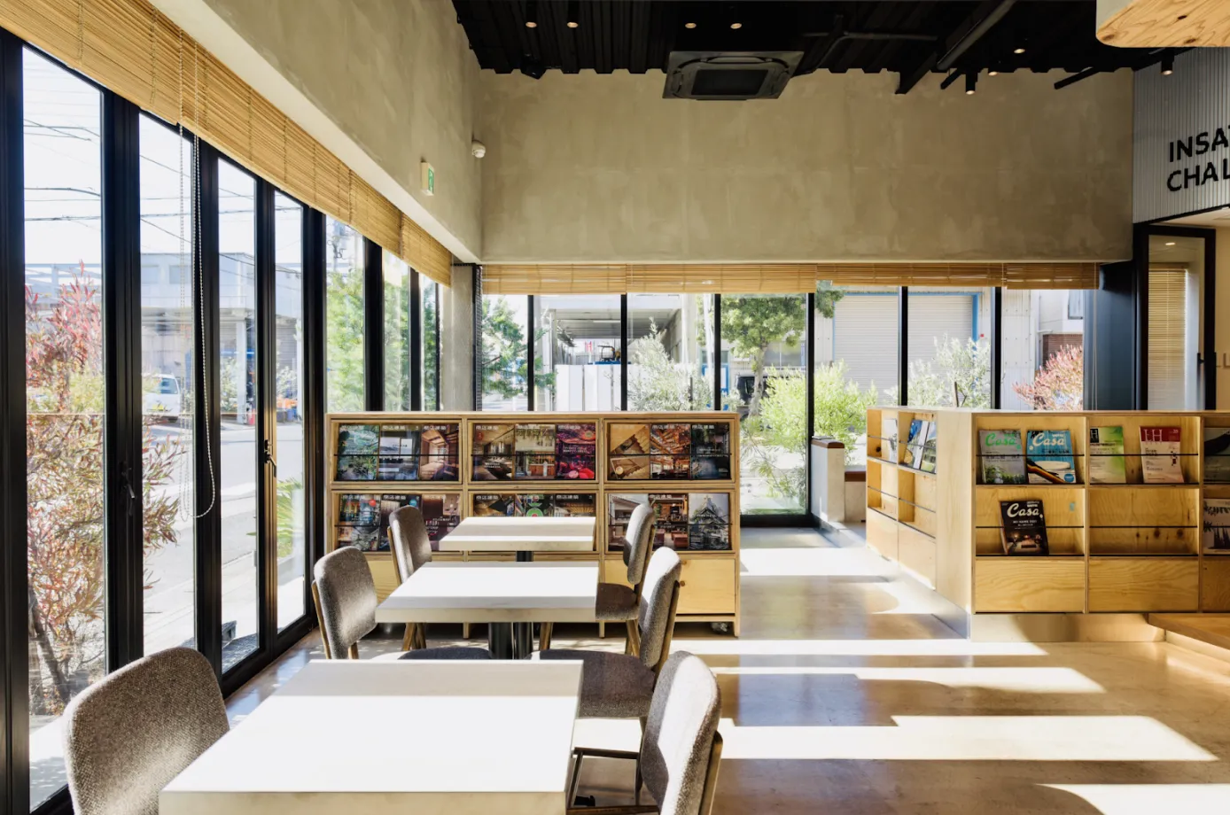 白やナチュラルウッドを基調とした内装に黒枠の大きなガラス窓がアクセントとなり、シンプルながらおしゃれでモダンな雰囲気を醸し出しています。