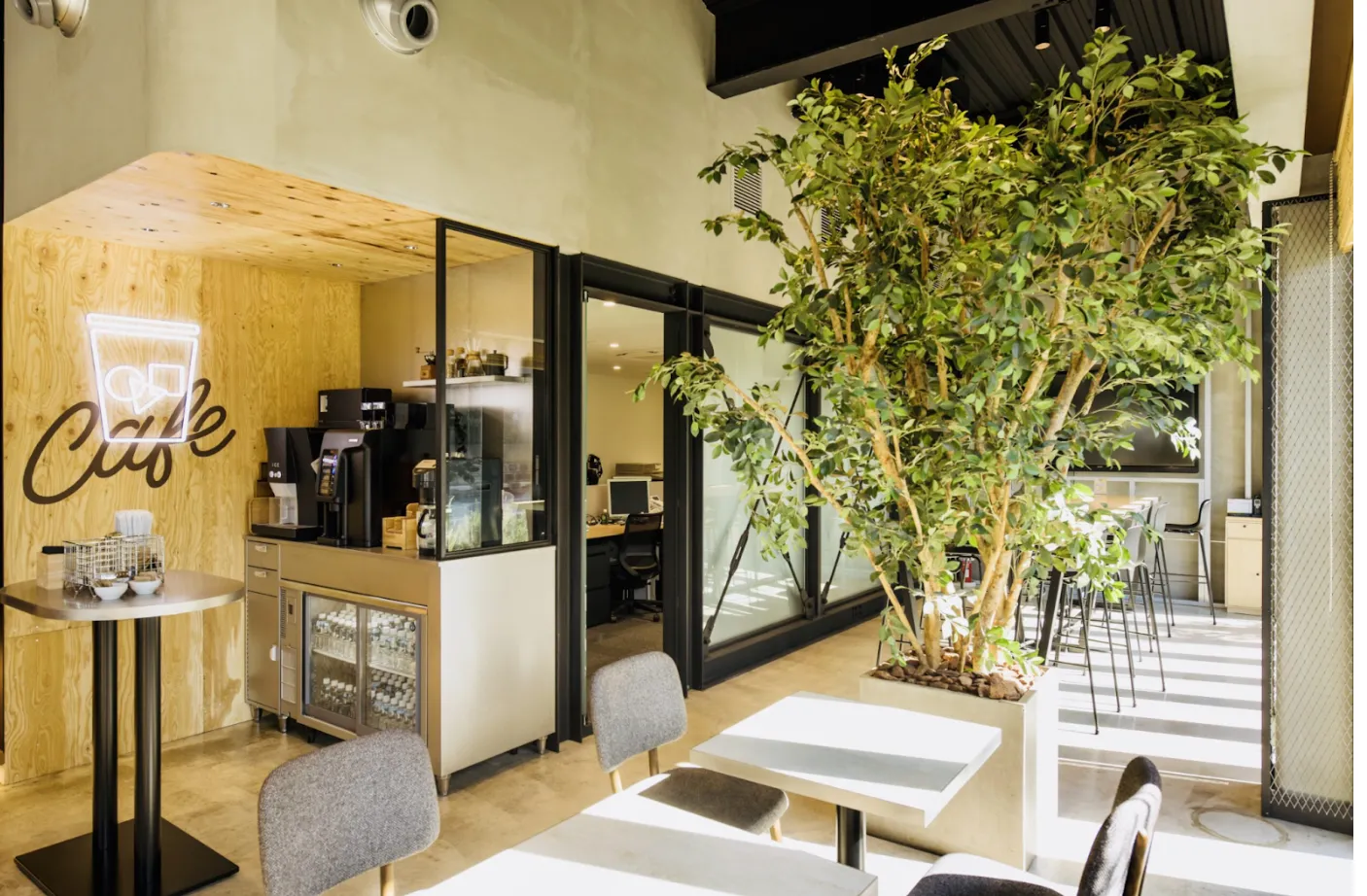 カフェスペースがレイアウトを工夫した執務室と打ち合わせスペースに