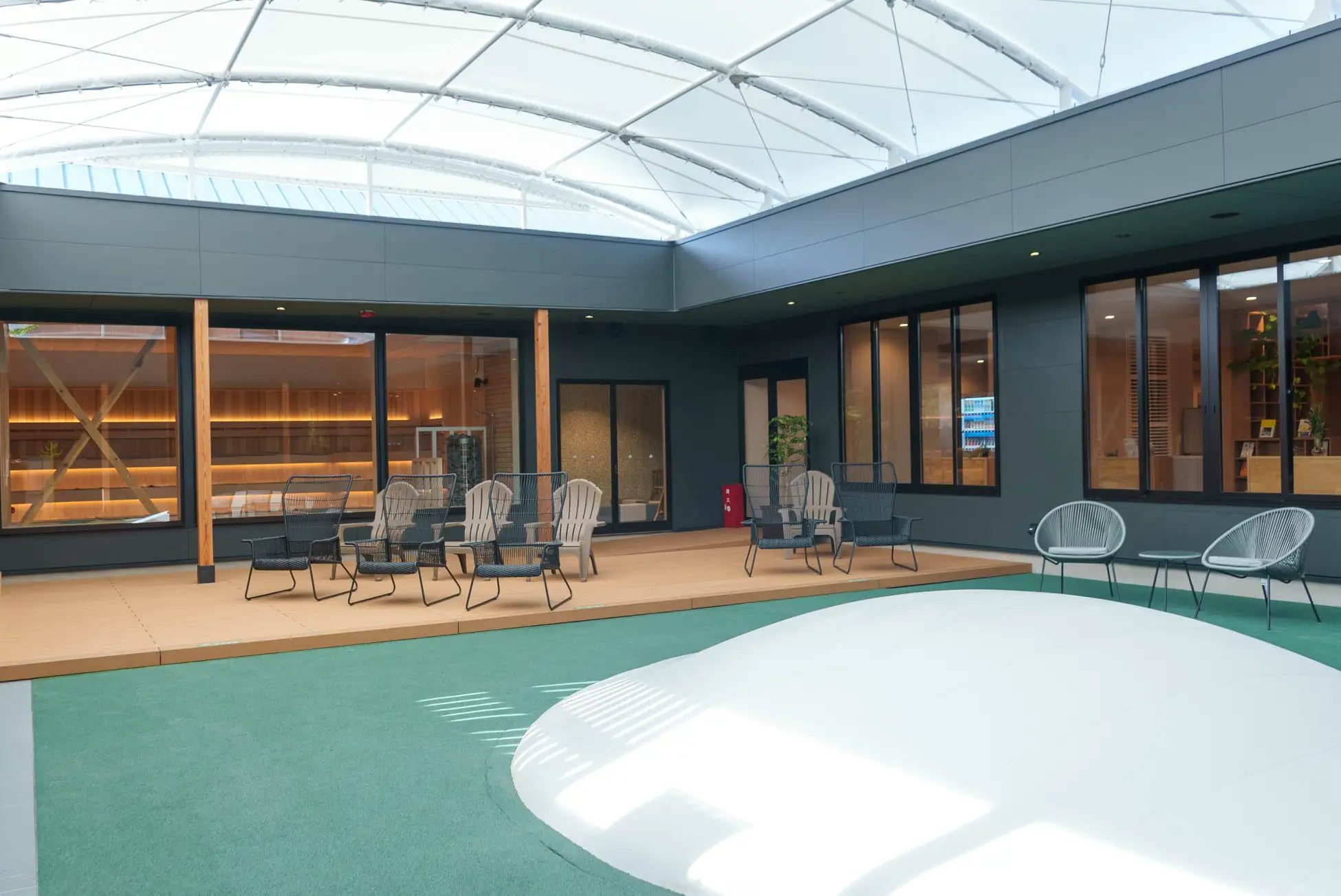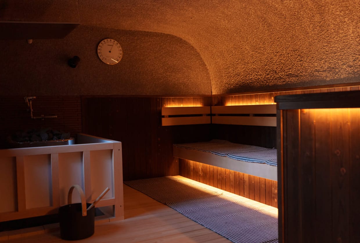 日本初の「泊まれる植物園」としてリニューアルされた茨城県植物園に新設された温浴施設です。本施設の大きな特徴は、男女ともに利用可能な外気浴サウナ。大開口の窓を備え、隣接する広場の「ふわふわドーム」を眺めながら、水着や館内着着用で男女一緒に入浴できる開放的な空間となっています。