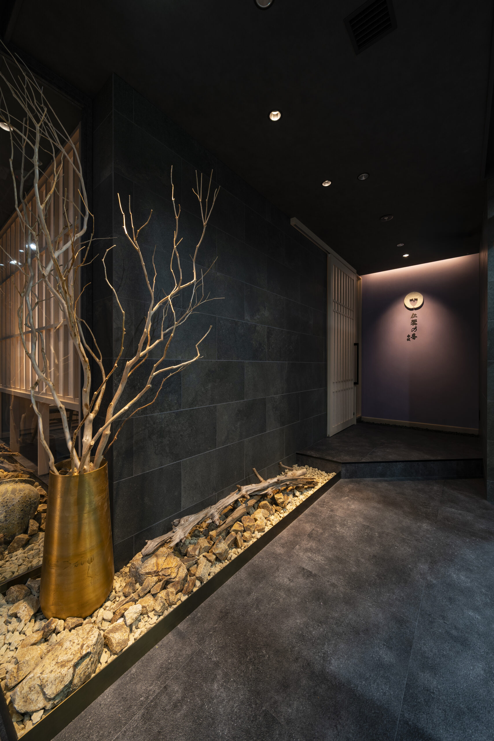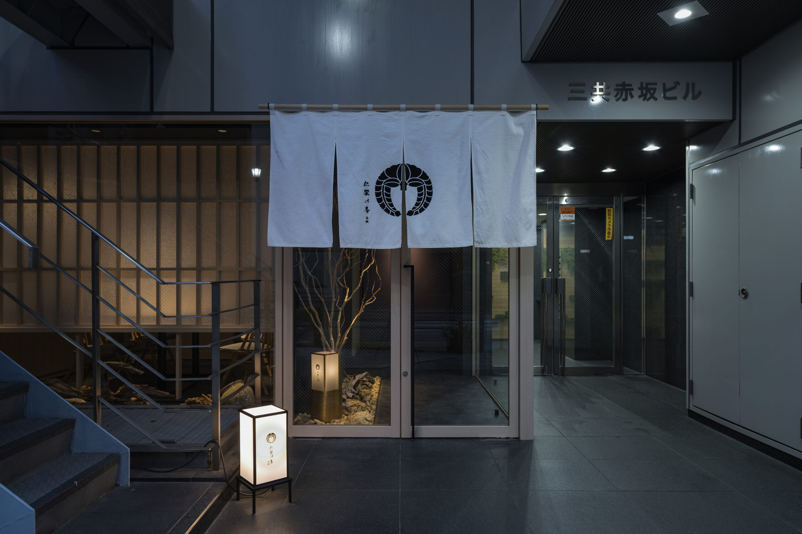 「仁饗の香 赤坂」は、全国に14営業所・23事業部を展開し、医療・福祉分野をはじめとする食事サービスを提供する富士産業株式会社様の直営店です。赤坂駅・乃木坂駅から徒歩5分という都心立地にありながら、大人の隠れ家のような落ち着いた佇まいが特徴。オーナー様の家紋「下がり藤」をあしらった暖簾や枯山水の意匠が、入店時から特別感と期待感を演出しています。