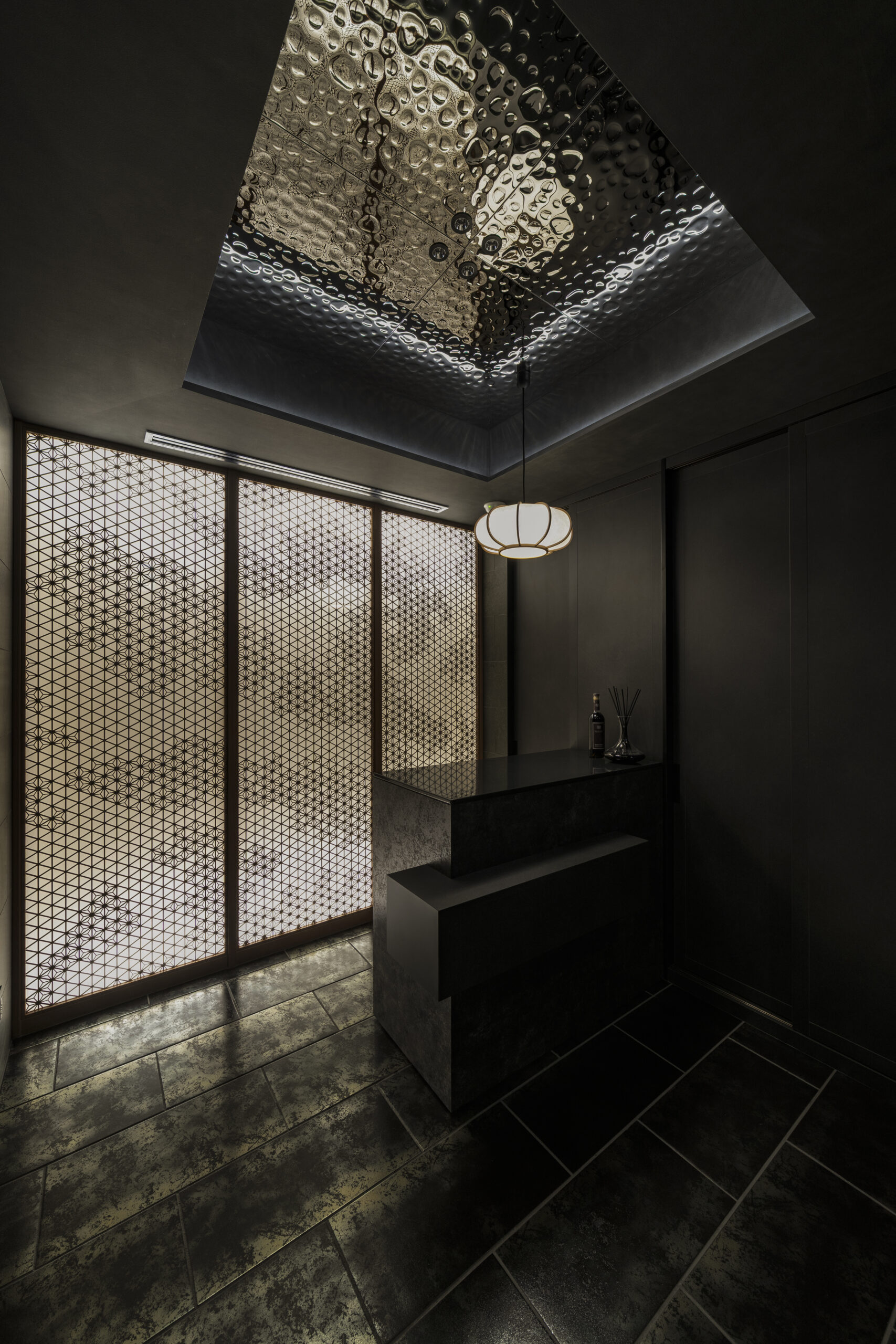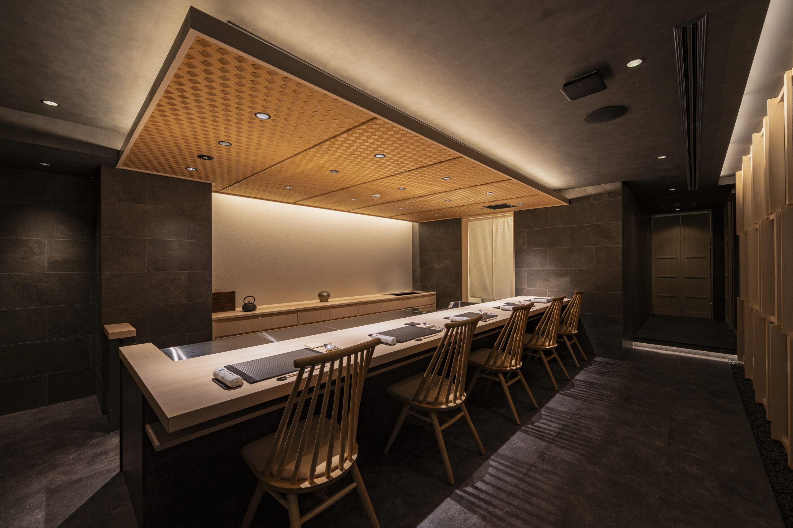 「静」の空間では、禅の思想に通じる“侘び”を表現し、なまこ絵や枯山水、網代といった要素を採用。一方、「動」の空間では、“雅”をテーマに、組子、襖絵、金箔和紙、水面板、装飾タイルなどを用い、華やかさと品格を兼ね備えた空間を構成しました。伝統技法と現代的な照明・色彩計画を融合させることで、赤坂に新たな割烹・懐石料理店の在り方を提示しています。