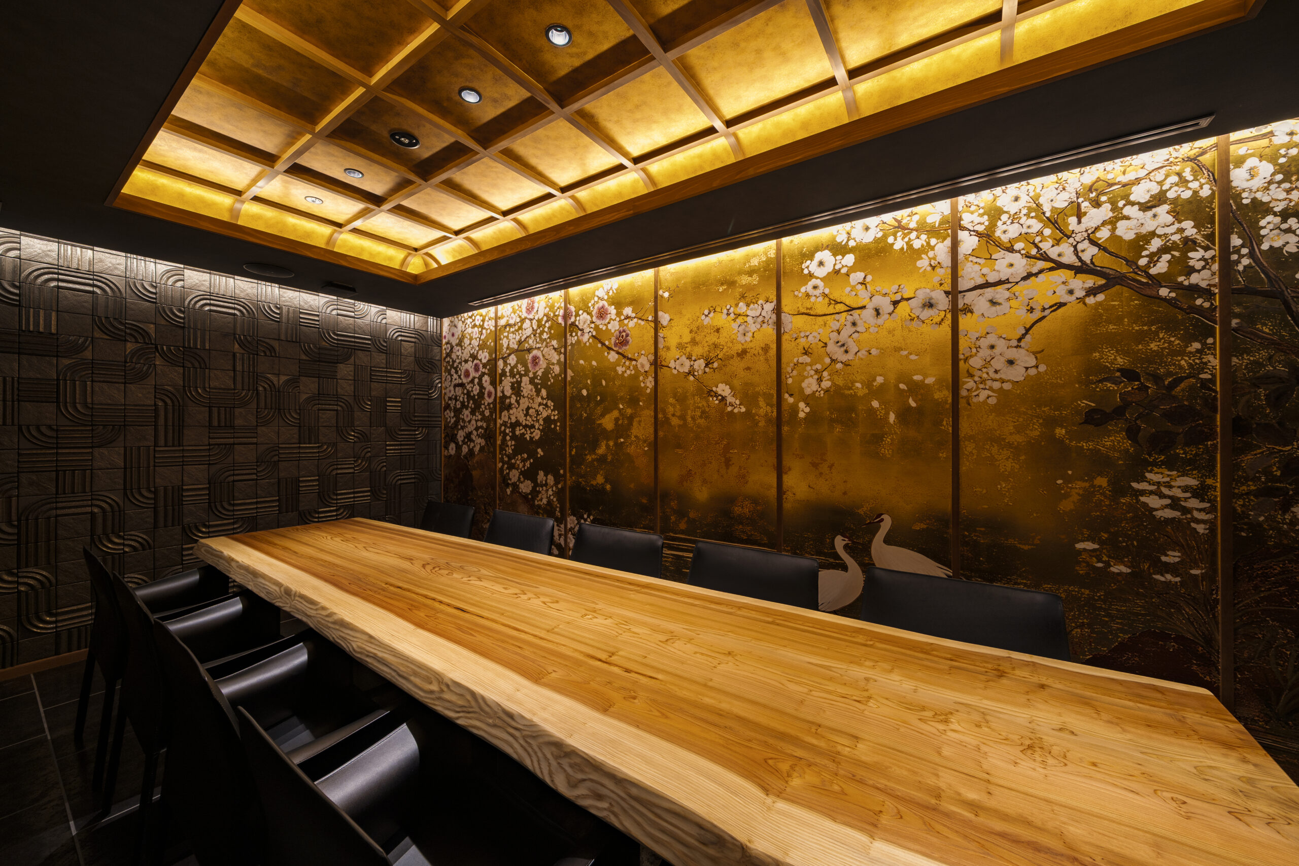 また、店内はカウンター席、個室に加え、金箔を一枚ずつ手作業で貼り重ねた和紙の襖絵を壁装飾とする特別室を備えています。